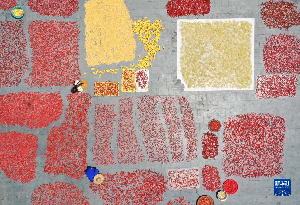 立秋過(guò)后,貴州高原鄉村處處曬秋忙。玉米、辣椒、稻谷、黃豆等農作物晾曬在農家房前屋后,與周?chē)鷦e具特色的田園風(fēng)光融為一體,繪就出一幅幅美麗的豐收圖景。