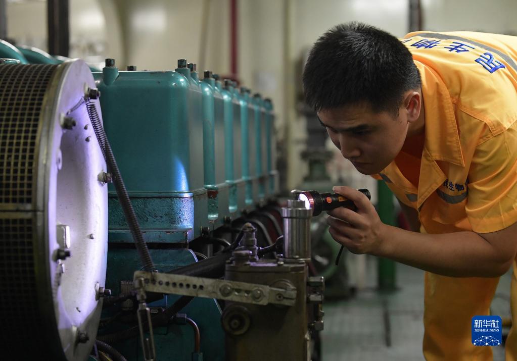 夜晚值守在輪機艙內的機工王小龍頂著(zhù)艙內高溫巡查設備運行情況(8月8日攝)。