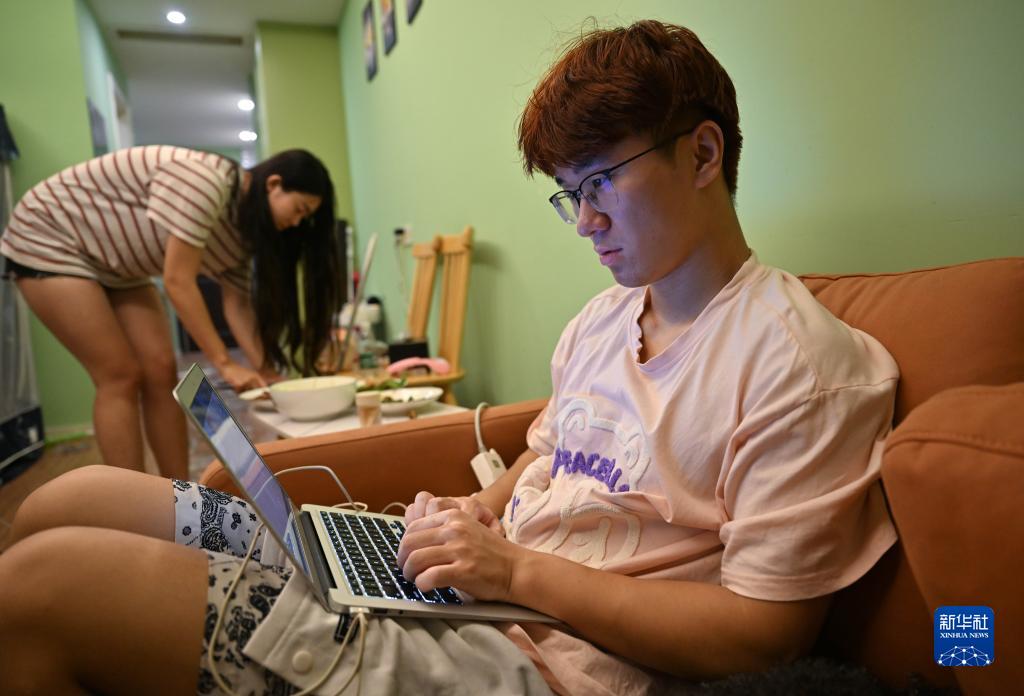 8月14日晚,張海洋(右)在家中上網(wǎng)課。他在俄羅斯阿列赫姆國立大學(xué)讀研二,受俄羅斯疫情影響,目前在國內通過(guò)網(wǎng)絡(luò )上課。