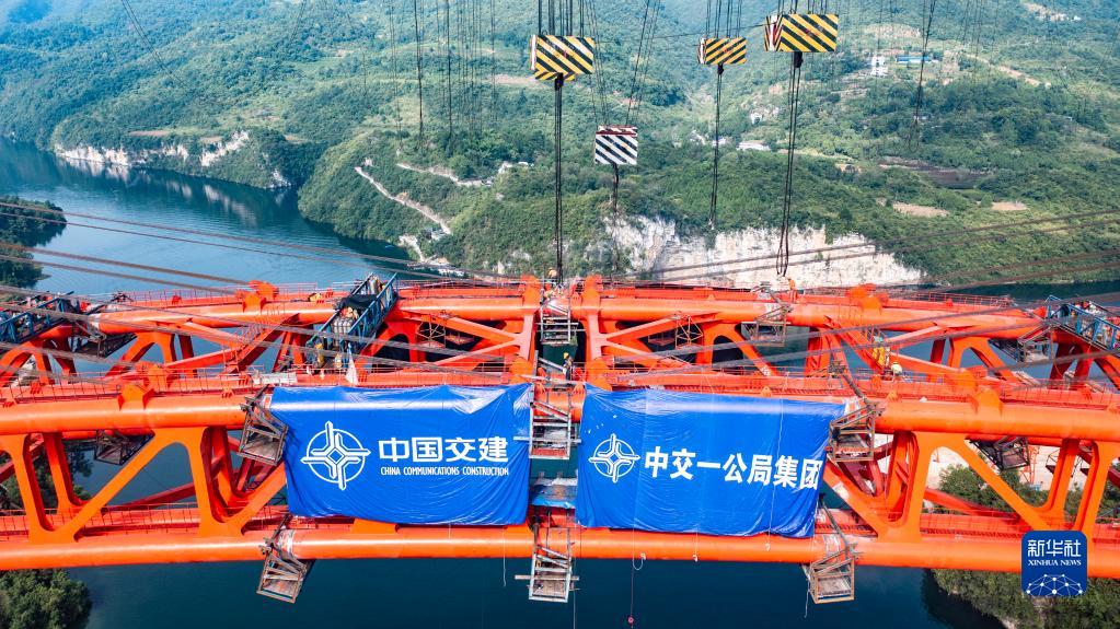 8月15日拍攝的德余高速烏江特大橋合龍現場(chǎng)(無(wú)人機照片)。