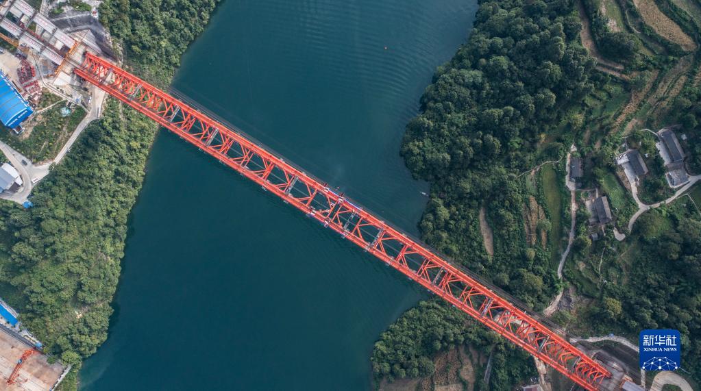 8月15日拍攝的德余高速烏江特大橋合龍現場(chǎng)(無(wú)人機照片)。