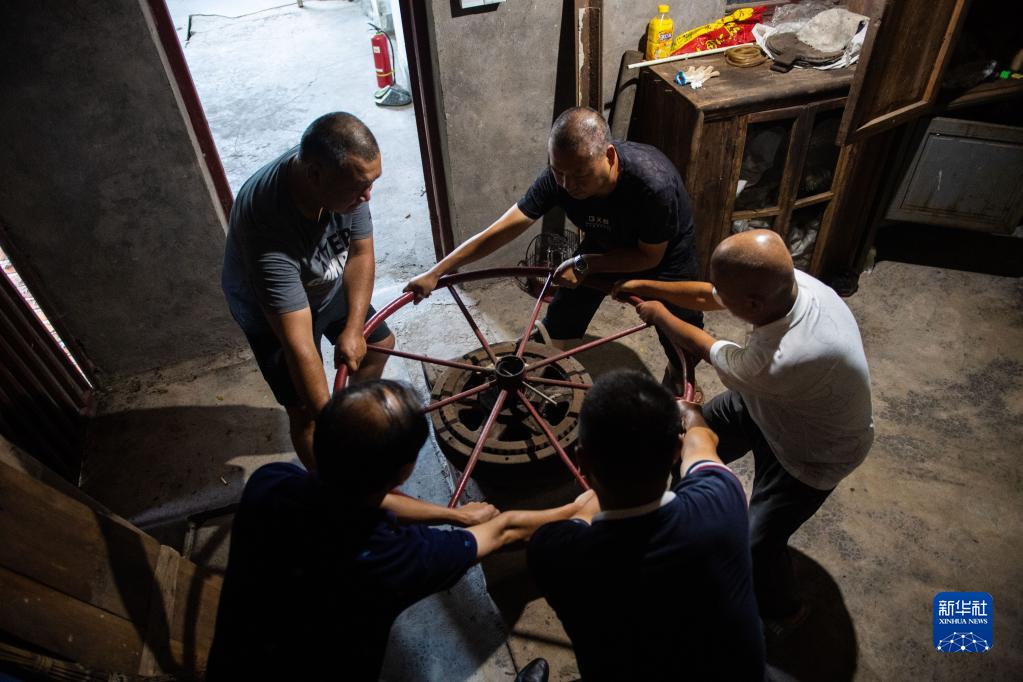 8月15日,在桃源縣三里溪水庫,水庫工作人員合力打開(kāi)灌溉水源控制閘。