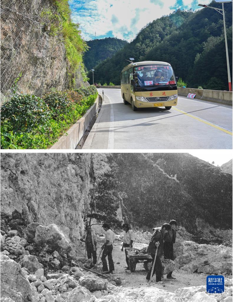 這是一張拼版照片。上圖為2022年6月23日拍攝的行駛在下黨村公路上的中巴客車(chē)(新華社記者周義攝);下圖為1990年7月下黨村村民修路的場(chǎng)景(資料照片)。