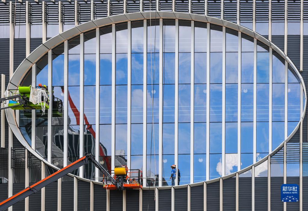 建設者在香港科技大學(xué)(廣州)圖書(shū)館清潔幕墻(8月16日攝)。