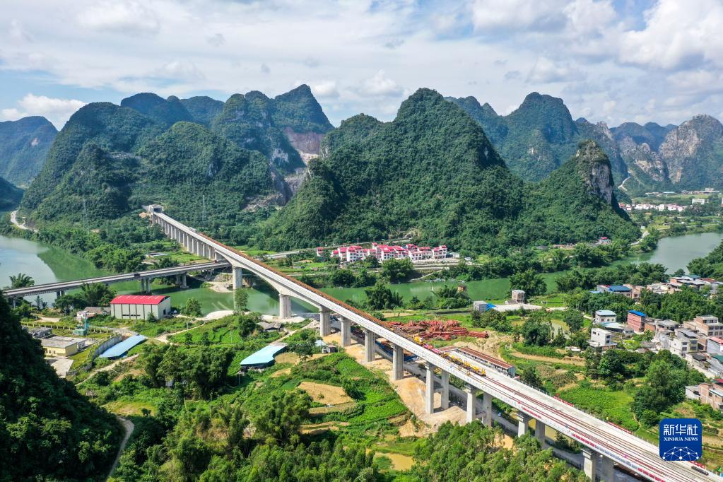 這是8月16日拍攝的貴南高鐵廣西段龍江雙線(xiàn)特大橋(無(wú)人機照片)。