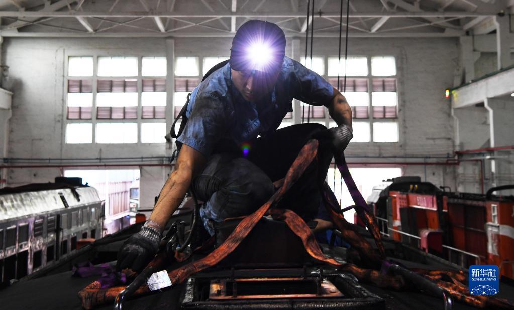 8月16日,廣州機務(wù)段職工在機車(chē)車(chē)頂進(jìn)行吊運作業(yè)。