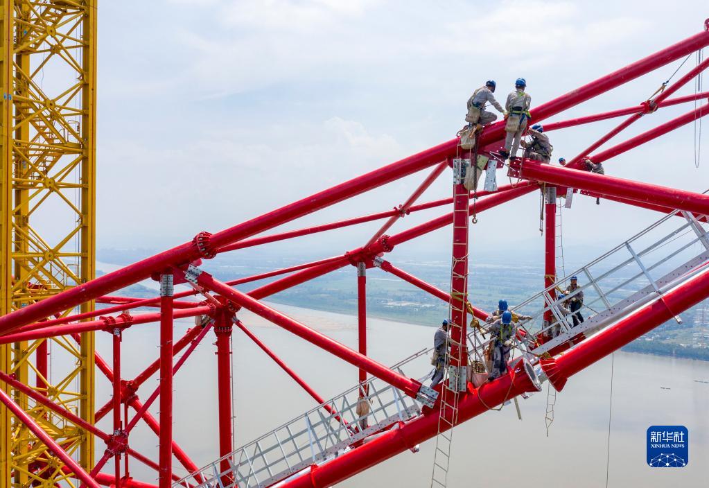白鶴灘至浙江特高壓直流輸電工程安徽段長(cháng)江跨越塔全部組立完成