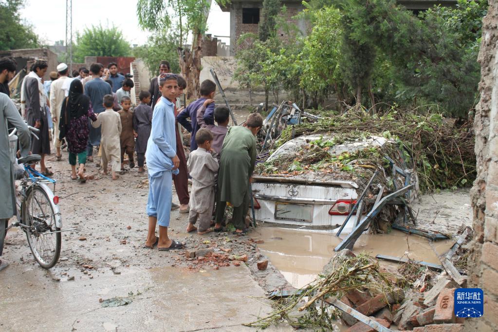 8月15日,人們聚集在阿富汗楠格哈爾省一輛遭洪水損毀的汽車(chē)旁。