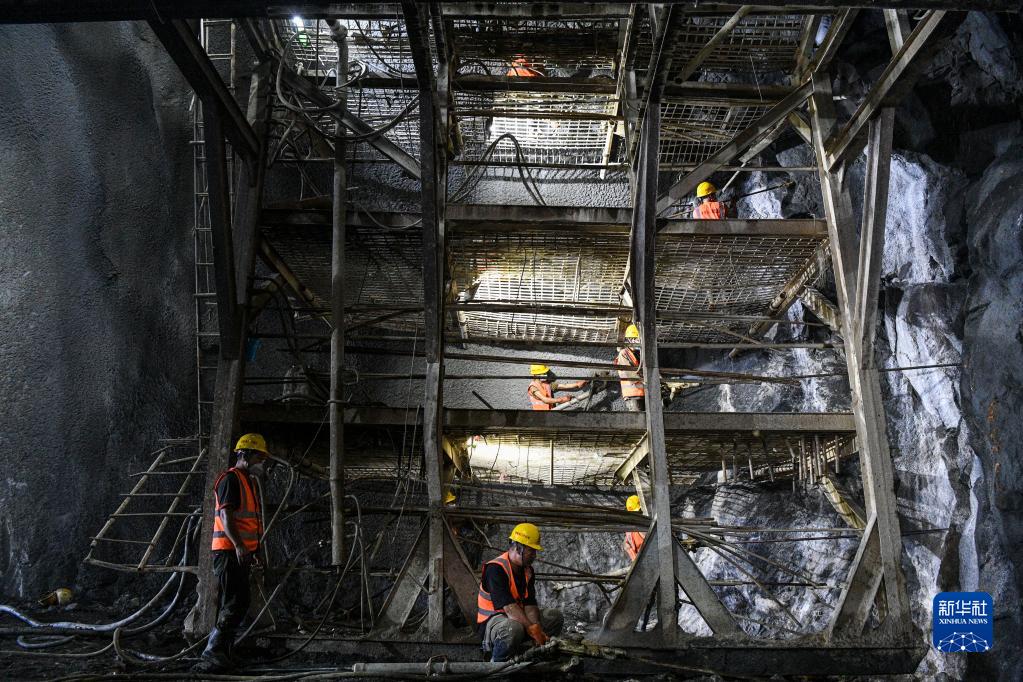 8月16日,在位于廣西環(huán)江毛南族自治縣的貴南高鐵九萬(wàn)大山四號隧道內,工作人員用風(fēng)槍打爆破眼。