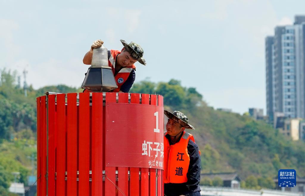 8月16日,長(cháng)江重慶航道局巴南航道處的兩名航道工在長(cháng)江的一處石梁上進(jìn)行航標燈的日常維護檢修。