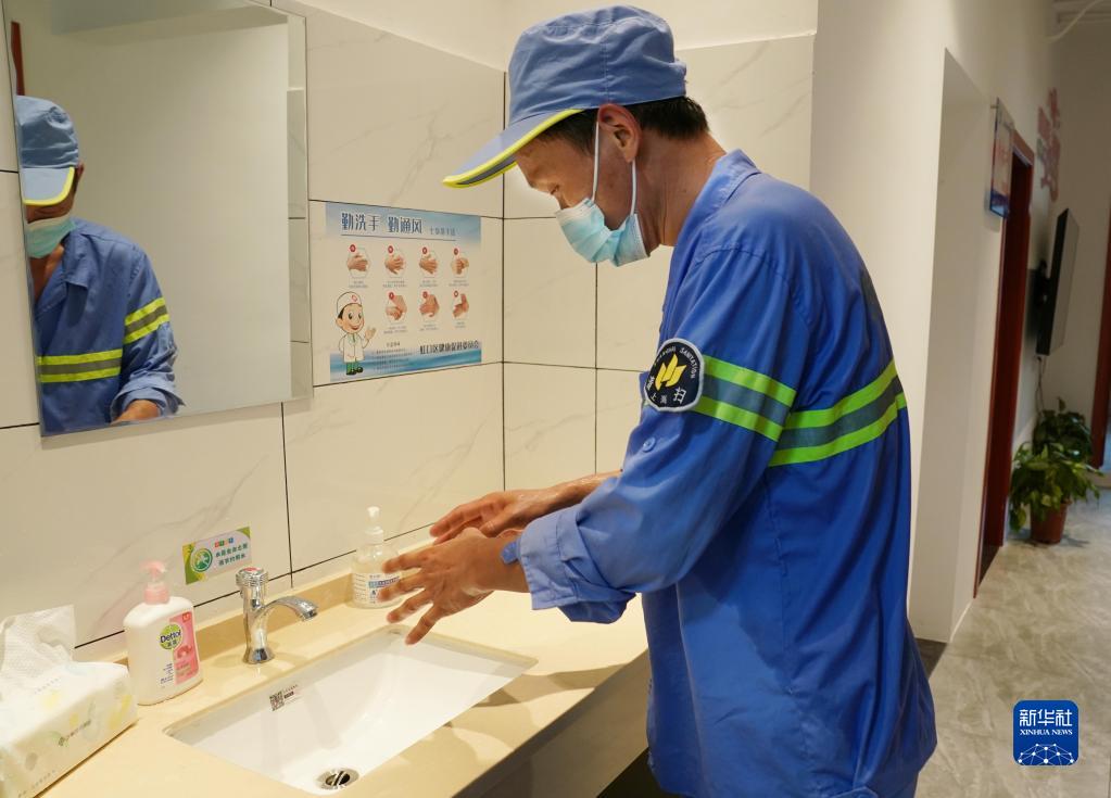 8月16日,來(lái)愛(ài)心驛站休息的環(huán)衛工人冉景濤在水池前洗臉,他的上衣已被汗水浸透。