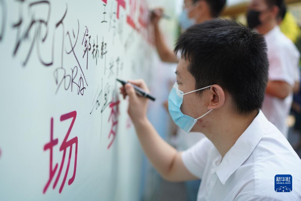 在位于南昌的江科附中高中部畢業(yè)典禮上,劉熙鴻在簽名墻簽名(8月13日攝)。