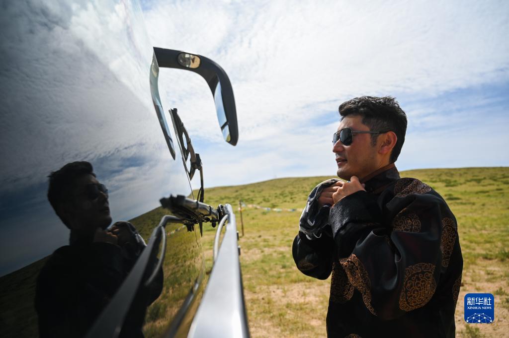8月17日,在敦達烏蘇嘎查演出點(diǎn),烏蘭牧騎隊員在大巴車(chē)前整理服裝。