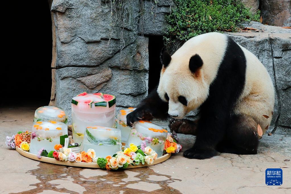 8月18日,中國大熊貓保護研究中心都江堰基地7歲的雄性大熊貓“青青”在享受清涼生日美食。
