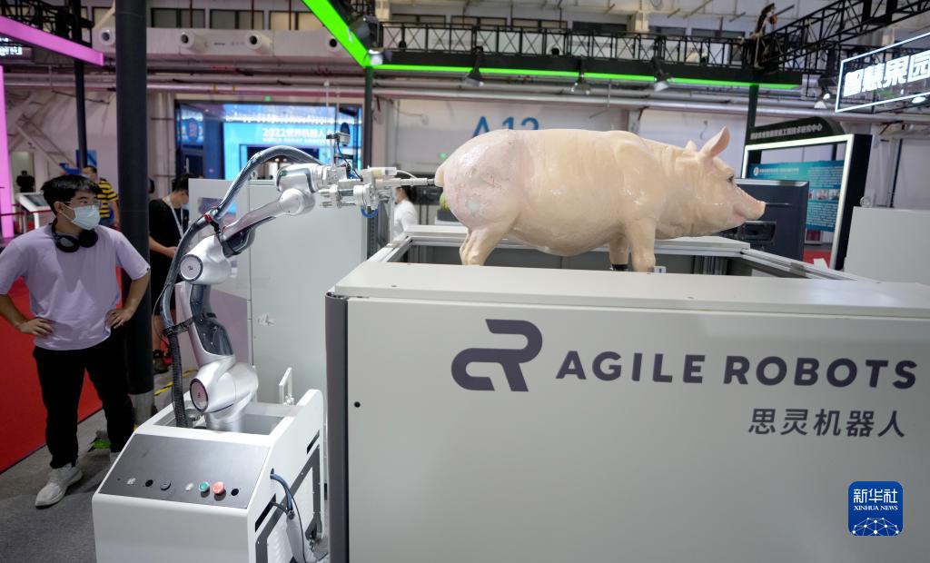 8月18日在2022世界機器人大會(huì )上拍攝的可以給豬注射疫苗的機器人。
