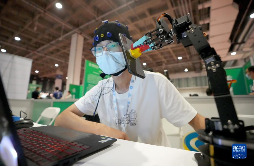 8月18日,工作人員在演示腦控機械臂拿手機。人的雙手被占用時(shí),可通過(guò)腦電信號控制機械臂拿東西。