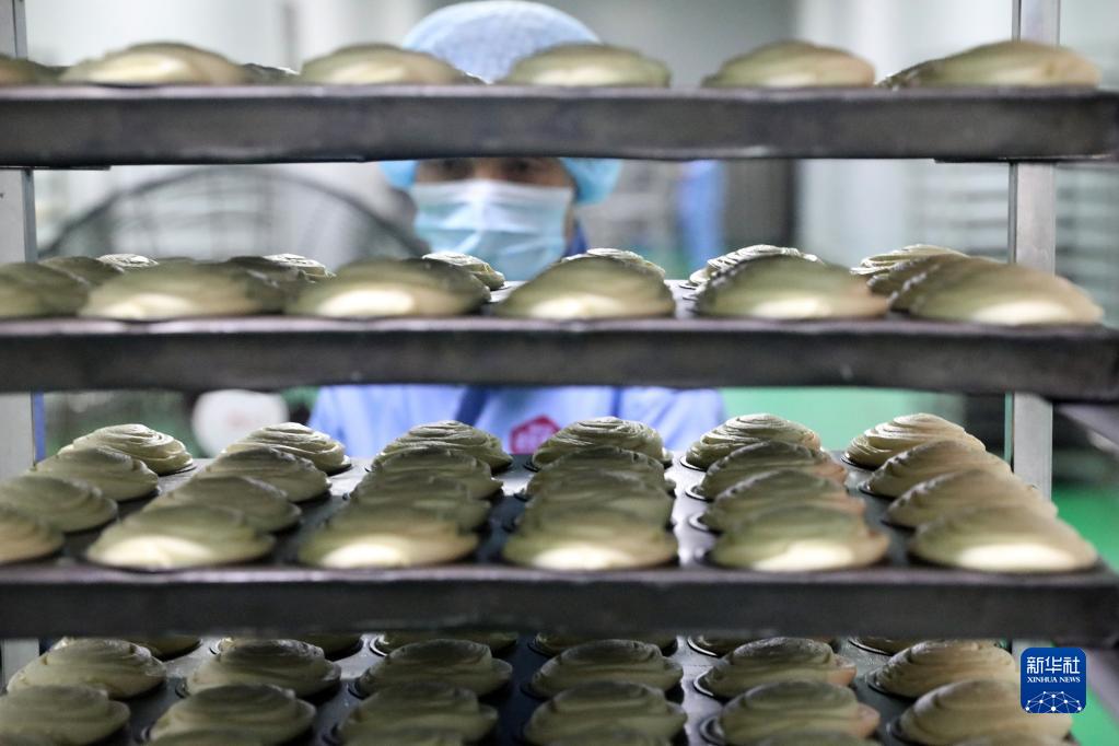 8月18日,在河北馬家麥坊食品有限公司面包生產(chǎn)車(chē)間,工人在搬運醒發(fā)后的面團入爐烤制。