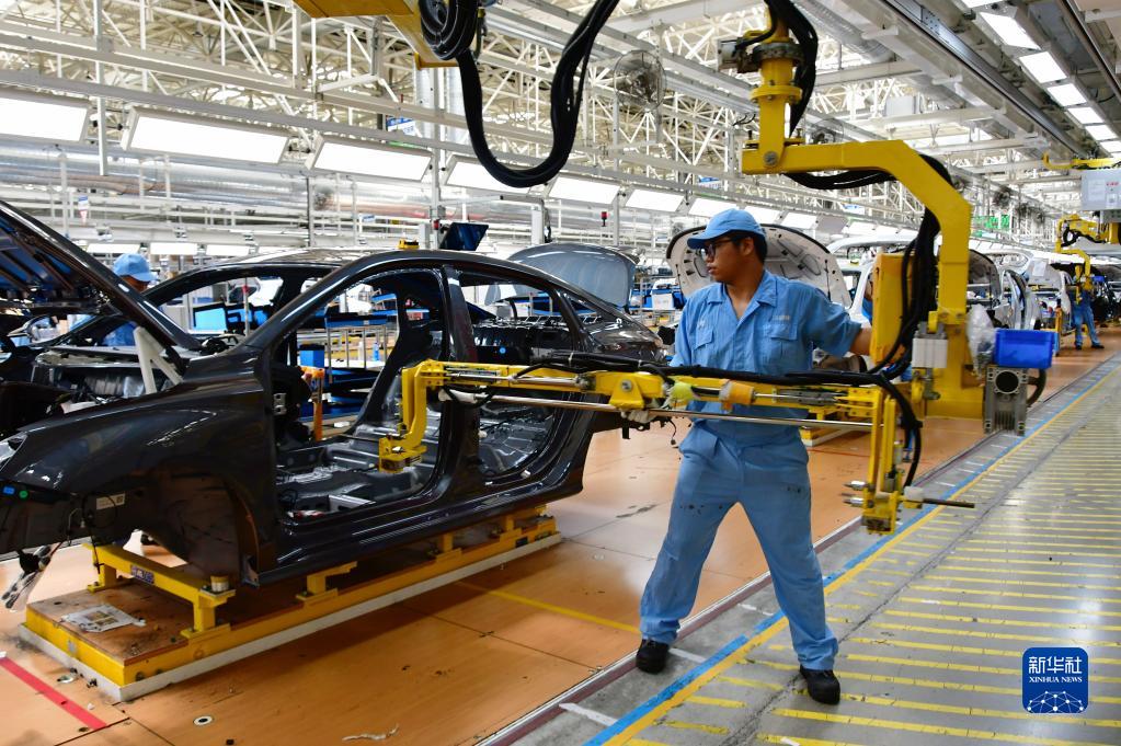 8月18日,在上汽集團乘用車(chē)寧德基地總裝車(chē)間,工人在新能源汽車(chē)生產(chǎn)線(xiàn)上作業(yè)。