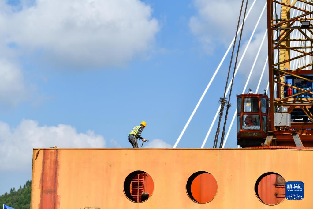8月19日,工人在合龍后的貴州龍里河大橋上對附屬工程進(jìn)行施工。
