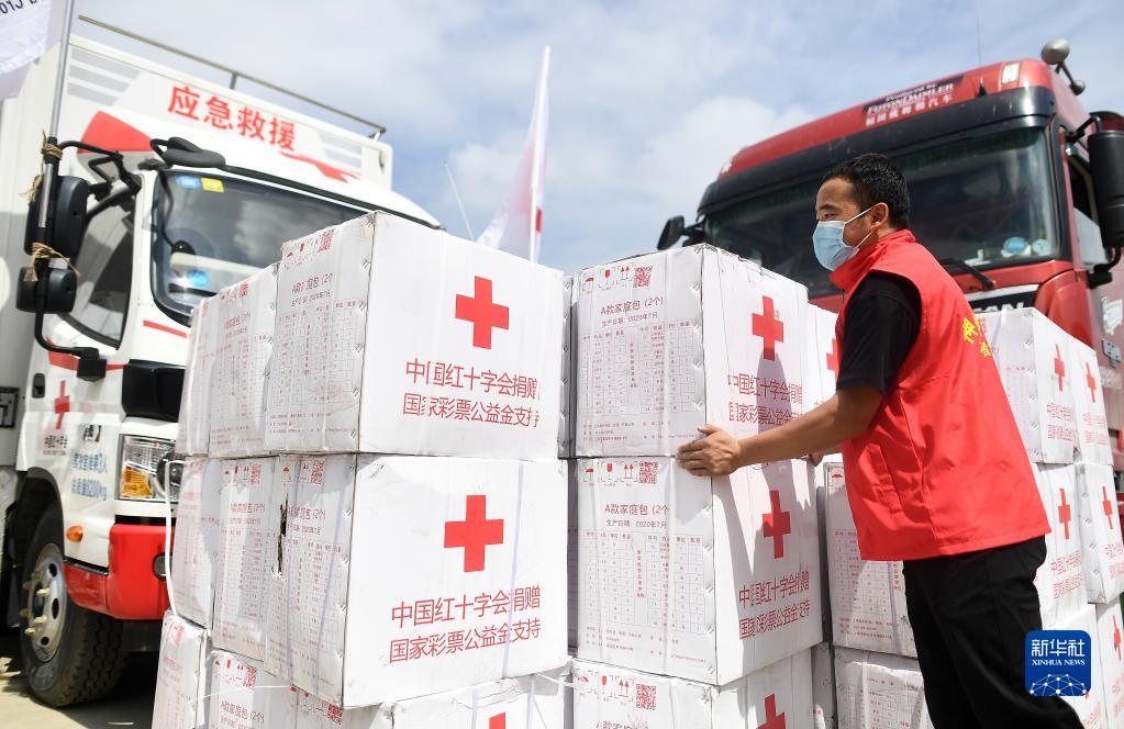 8月19日,青海省紅十字會(huì )志愿者在大通一中臨時(shí)安置點(diǎn)整理救災物資準備發(fā)放。