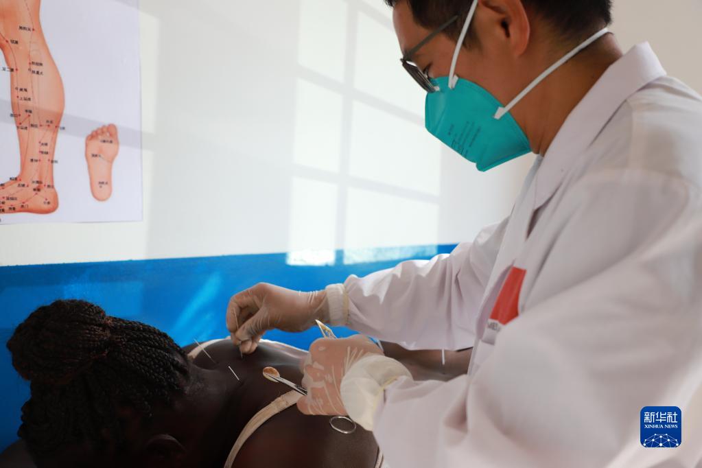 8月19日,在烏干達首都坎帕拉的中烏友好醫院,針灸師李曉斌為當地患者進(jìn)行中醫針灸治療。