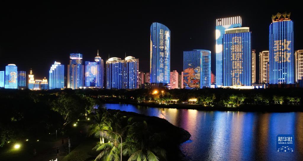 8月19日在??谑袨I海大道拍攝的中國醫師節主題燈光秀(無(wú)人機照片)。