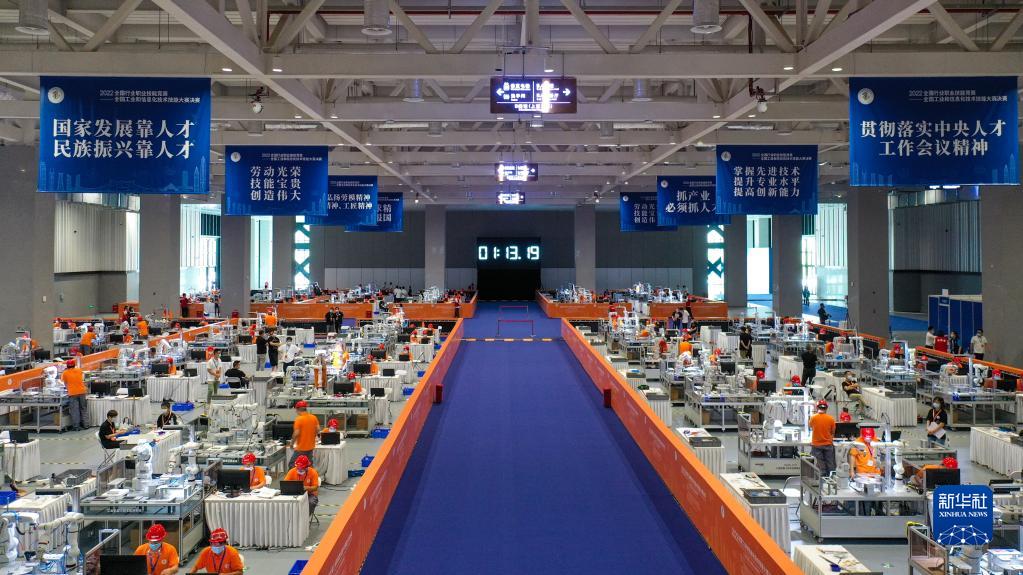工業(yè)機器人技術(shù)應用項目比賽現場(chǎng)(8月19日攝,無(wú)人機照片)。