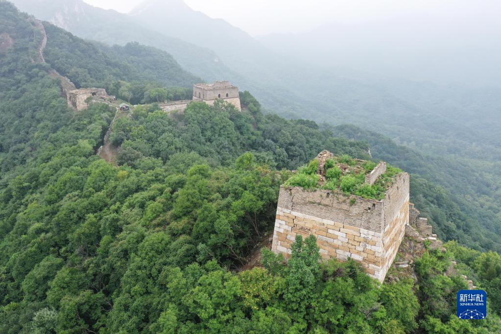 這是即將進(jìn)入研究性修繕的141號敵臺(前)、正在進(jìn)行考古發(fā)掘的142號敵臺(中)和已完成考古發(fā)掘的143號敵臺(后)(8月17日攝,無(wú)人機照片)。