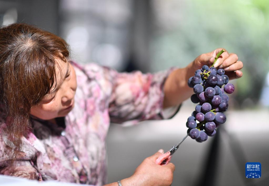 8月19日,果農在位于西安市鄠邑區的一家農業(yè)科技有限公司葡萄種植園內對即將發(fā)貨的新鮮葡萄進(jìn)行修剪。