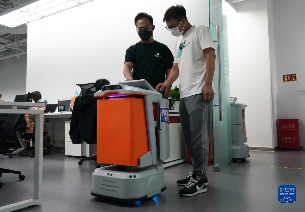 在北京市海淀區中關(guān)村東升科技園,一家商用機器人公司的工作人員在調試服務(wù)機器人(8月17日攝)。