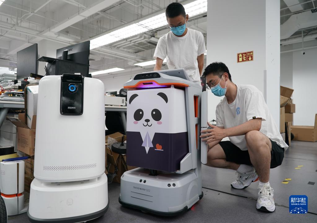 在北京市海淀區中關(guān)村東升科技園,一家商用機器人公司的工作人員在調試服務(wù)機器人(8月15日攝)。