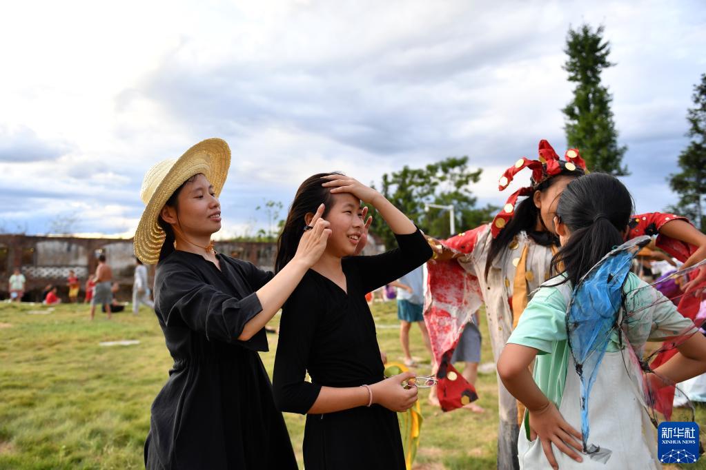 今年7月,附近村莊和鄰近縣市的70多個(gè)孩子參加了大元社的暑期活動(dòng),在完成基本學(xué)業(yè)之余,學(xué)習手工、繪畫(huà)、音樂(lè )等藝術(shù)相關(guān)課程。8月20日傍晚,孩子和村民們一起舉辦的藝術(shù)節便是“結業(yè)典禮”。為了準備藝術(shù)節的重頭戲——沉浸式戲劇,孩子們自己打磨劇本、設計服裝、調試燈光,40多個(gè)孩子穿著(zhù)自己設計的服裝,期待著(zhù)屬于他們的鄉村藝術(shù)節。