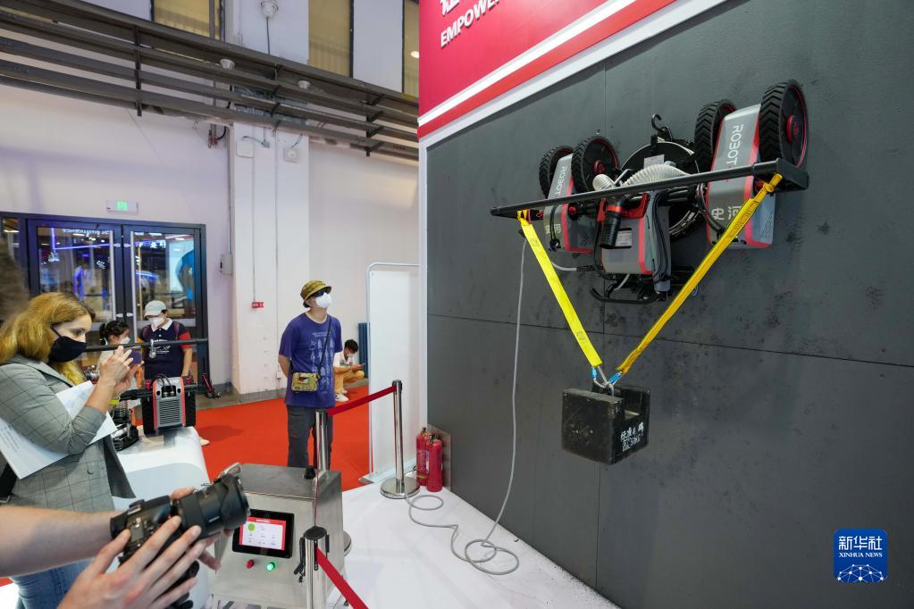 參觀(guān)者在2022世界機器人博覽會(huì )“機器人+商用”區域觀(guān)看一款水射流清理機器人(8月18日攝)。該機器人適用于船體外殼、甲板及內艙等部位的清洗除銹作業(yè)。