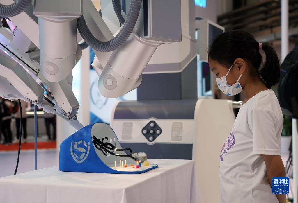 在2022世界機器人博覽會(huì )“機器人+醫療”展區現場(chǎng),參觀(guān)者觀(guān)看單孔腔鏡手術(shù)機器人(8月19日攝)。