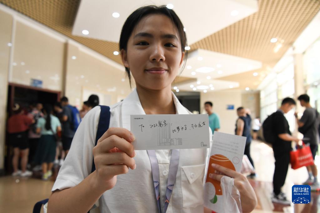 8月21日,中國科學(xué)技術(shù)大學(xué)2022級本科新生陳燁泓展示寫(xiě)有學(xué)長(cháng)學(xué)姐祝福的明信片。