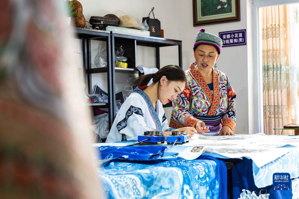 8月18日,張娟娟的母親在蠟染工作室指導張娟娟繪制蠟版畫(huà)。