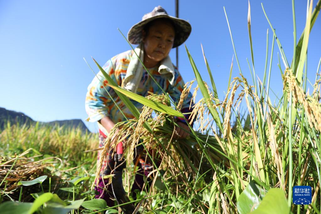 8月22日,村民在重慶市秀山土家族苗族自治縣溶溪鎮一處稻田收割水稻。