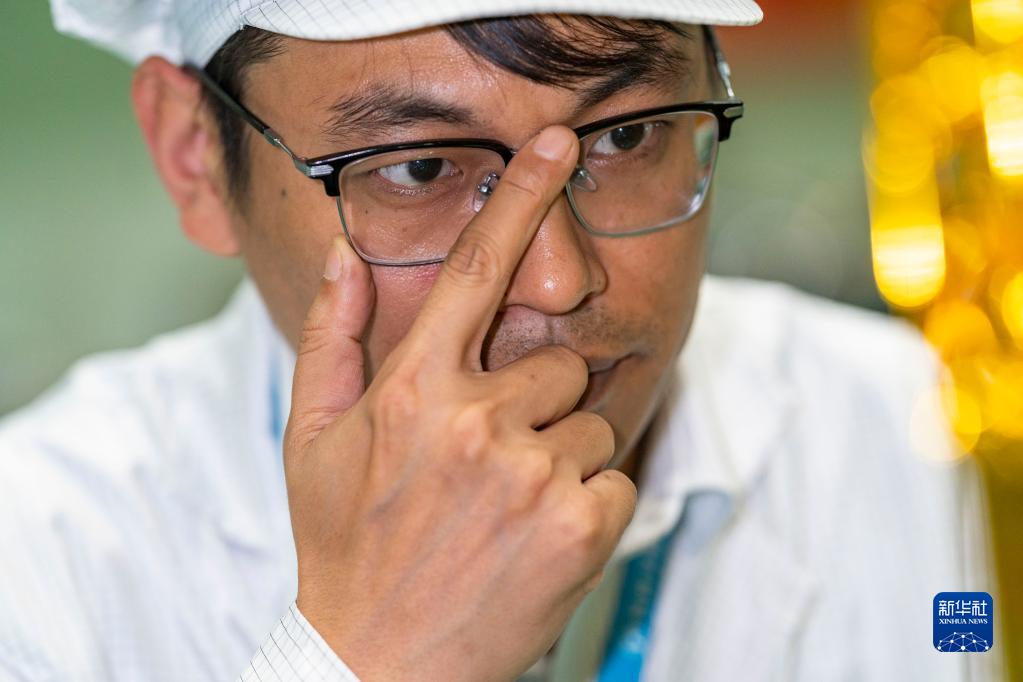 2022年8月3日,在長(cháng)光衛星技術(shù)股份有限公司總裝車(chē)間,項目總師陳茂勝踏查“吉林一號”高分03衛星生產(chǎn)工作。