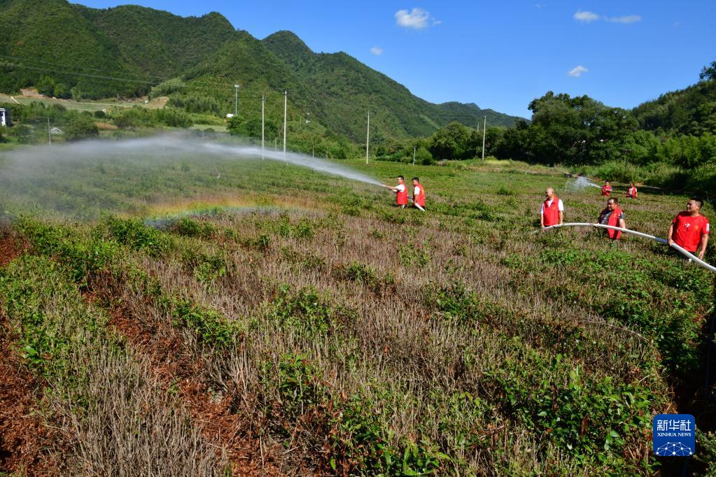 8月22日,在浙江省建德市乾潭鎮一處茶園,黨員志愿者幫助茶農澆水抗旱。