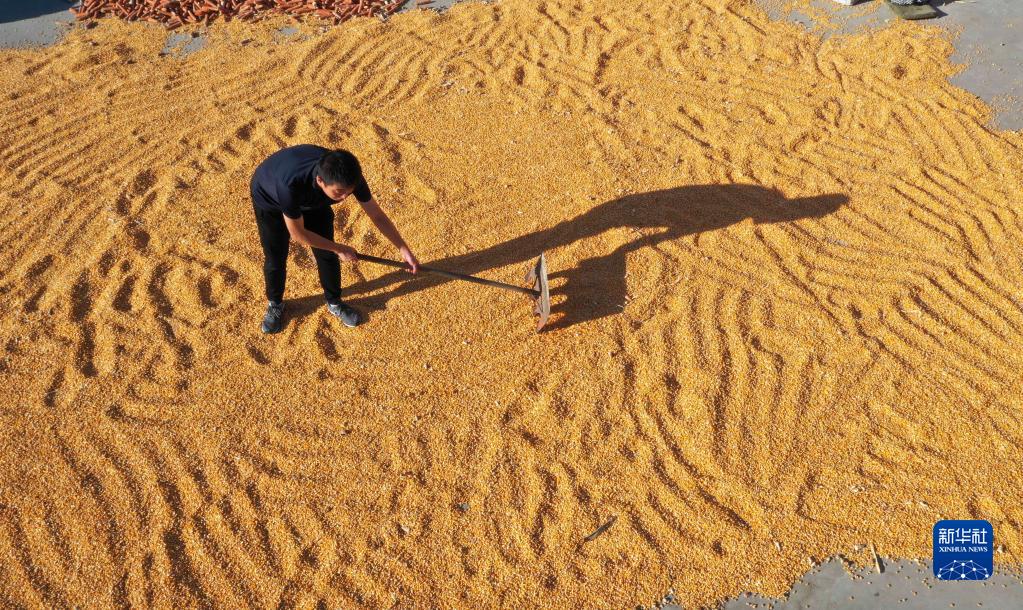8月22日,河北省玉田縣虹橋鎮南會(huì )村村民在場(chǎng)院晾曬玉米(無(wú)人機照片)。