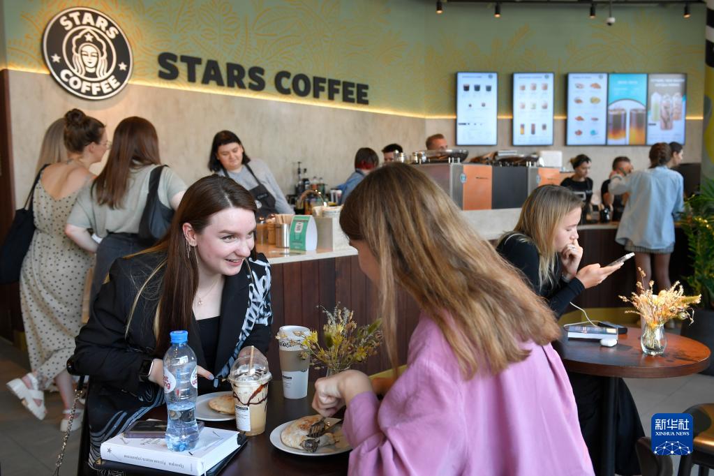 8月22日,人們在俄羅斯莫斯科一家“星咖啡”門(mén)店用餐。