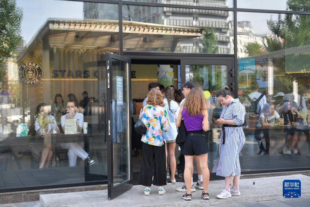 8月22日,人們在俄羅斯莫斯科排隊等待進(jìn)入一家“星咖啡”門(mén)店。