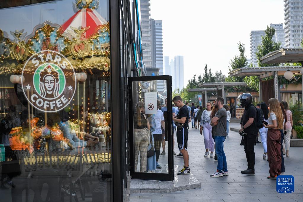 8月22日,人們在俄羅斯莫斯科排隊等待進(jìn)入一家“星咖啡”門(mén)店。