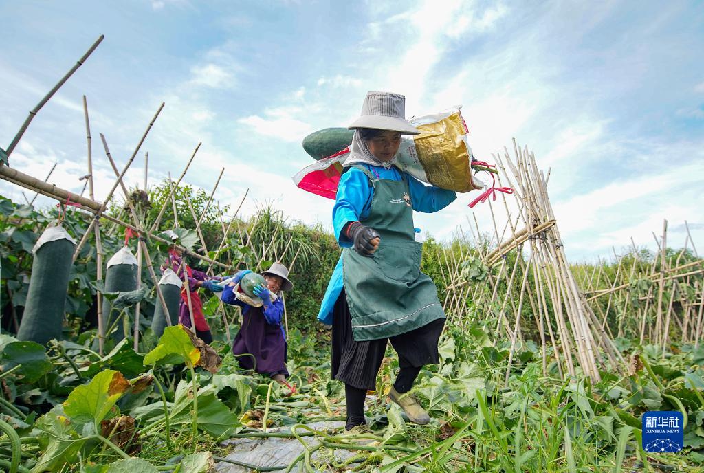 8月23日,村民在貴州省黔東南苗族侗族自治州丹寨縣龍泉鎮展良村搬運采收的冬瓜。