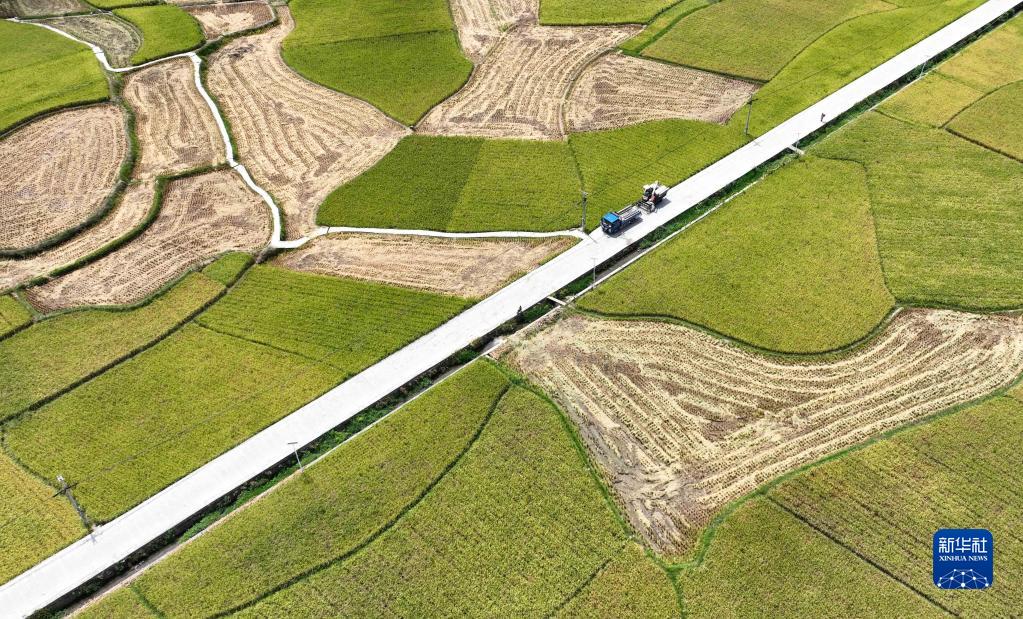 8月23日拍攝的貴州省綏陽(yáng)縣旺草鎮萬(wàn)畝大壩水稻收割現場(chǎng)(無(wú)人機照片)。