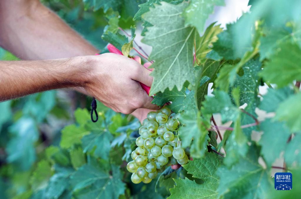 8月23日,工作人員在法國尼斯一家酒莊的葡萄園收割葡萄。