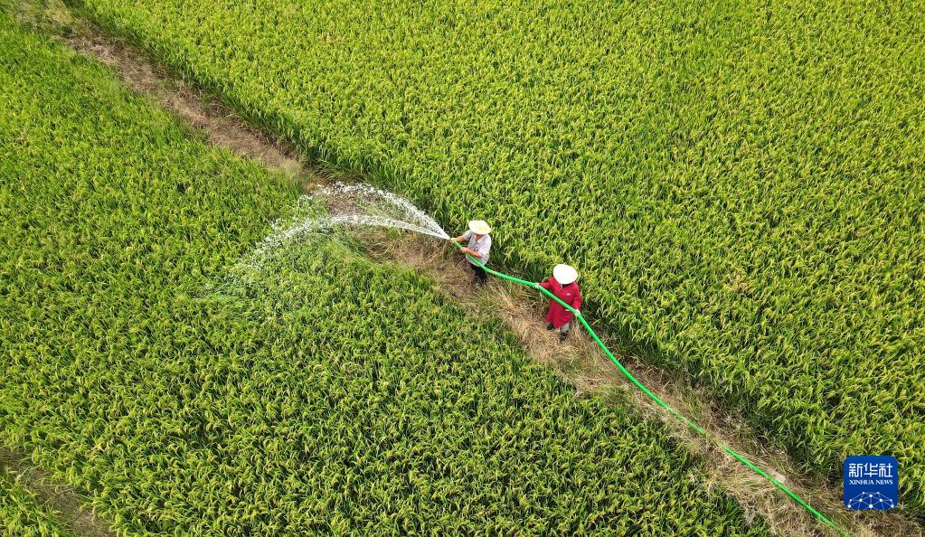 8月24日,肥西縣花崗鎮八里社區種糧大戶(hù)張守勤(左)利用剛打的水井灌溉水稻(無(wú)人機照片)。