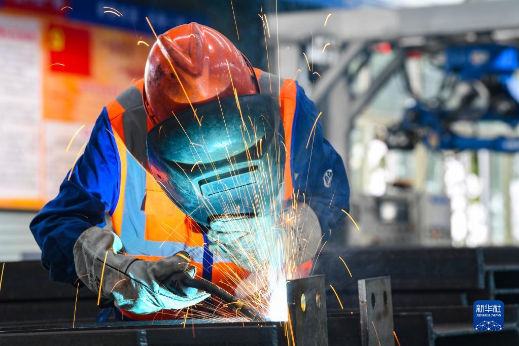 8月23日,工人在新建重慶至黔江鐵路站前3標智能化鋼構廠(chǎng)作業(yè)。