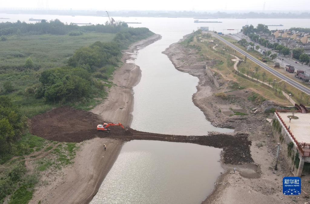 8月23日,在安徽省蕪湖市繁昌區荻港鎮黃滸河入長(cháng)江口附近河道里,施工機械在攔河筑壩,準備架設臨時(shí)抗旱站(無(wú)人機照片)。