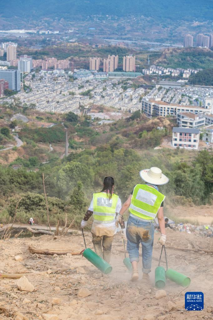8月26日,在重慶北碚區歇馬街道,志愿者往山下運送使用過(guò)的滅火器。